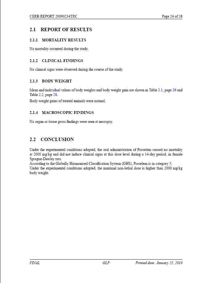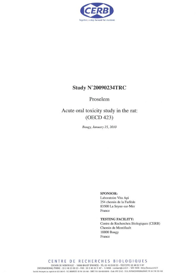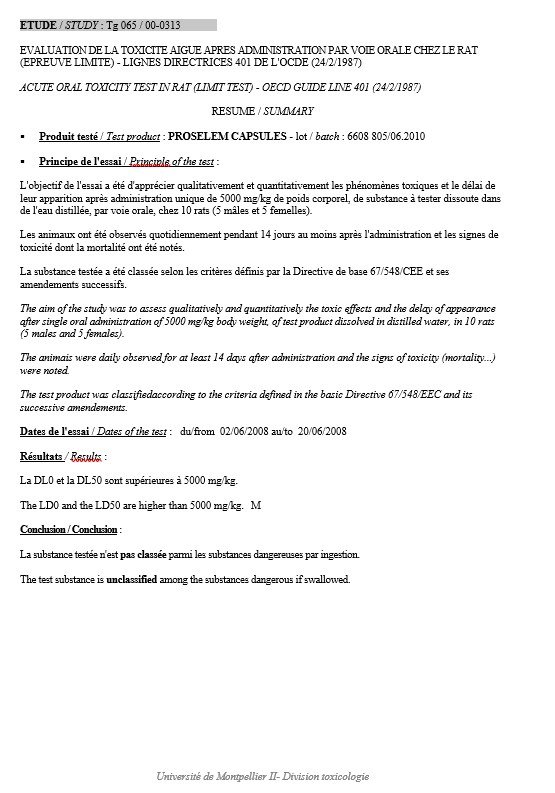 Compte tenu de la très grande biodisponibilité du Sélénium dans nos produits nous nous sommes interrogés sur la toxicité qui pouvait y avoir. Nous avons demandé au laboratoire de la faculté et au Centre de recherches biologiques de Baugy, laboratoire indépendant , de faire des tests sur le Proselem. La conclusion de ces essais montrent qu’il n’y a aucune toxicité même sur des grandes quantité (supérieure à 15 gélules)